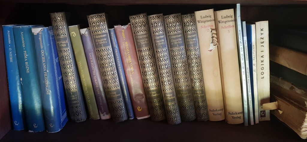 W bibliotece Lema znalazły się też na jednej półce XIX-wieczne wydanie „Dzieł” Schopenhauera i prace Wittgensteina – w tym także „Traktat” w przekładzie Wolniewicza: